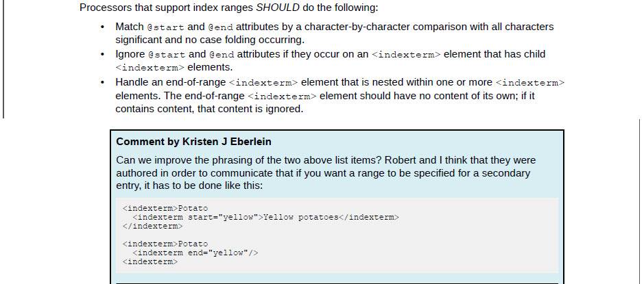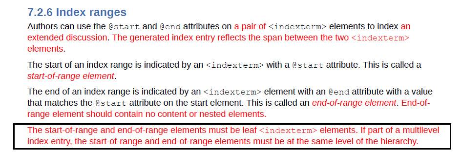 The first sentence now says "The start-of-range and end-of-range elements must be leaf <indexterm> elements." That seems to stand alone as an instruction about all ranges, but the point we were trying to address is only for ranges that are specified at the secondary/tertiary level. So – if you are setting up a range for a secondary index entry, the start-of-range and end-of-range both need to be secondary entries. That rule is correctly conveyed by the second sentence in your highlighted section – "If part of a multilevel index entry, the start-of-range and end-of-range elements must be at the same level of the hierarchy."